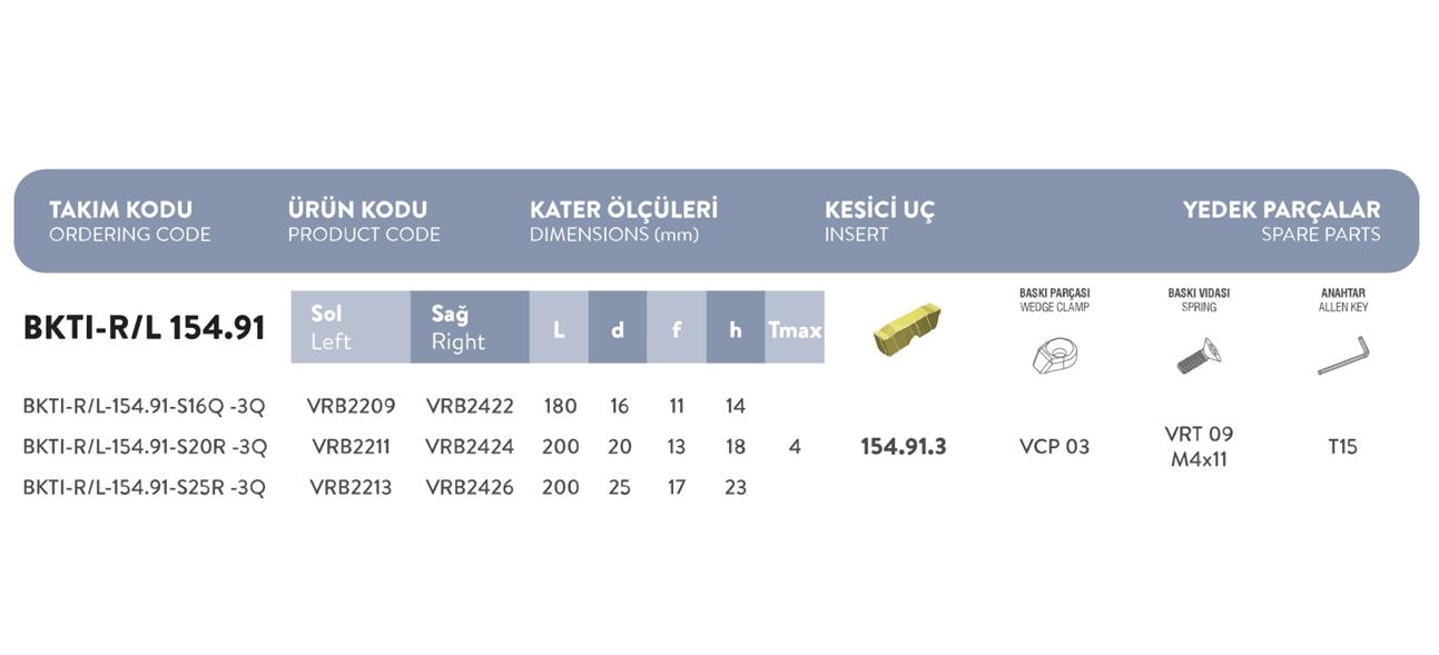 Fett BKTI-R/L – 154.91 – S16Q – 3Q..t-max:4 Vorgen Delik İçi Kanal Takımı