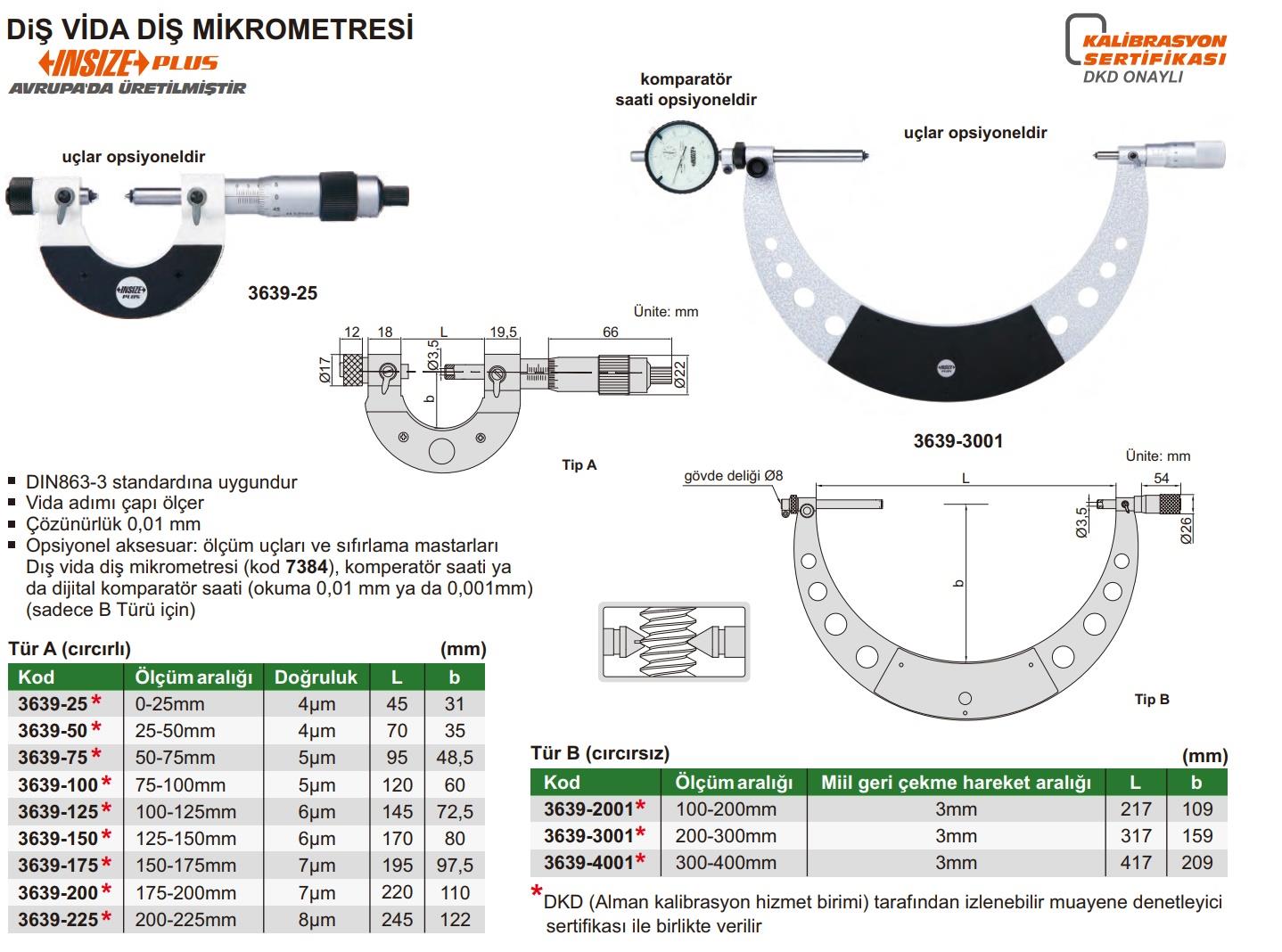 İnsize  300-400mm  Dış  Çap  Vida  Dişi  Mikrometresi,  Hassasiyet:  0.01mm