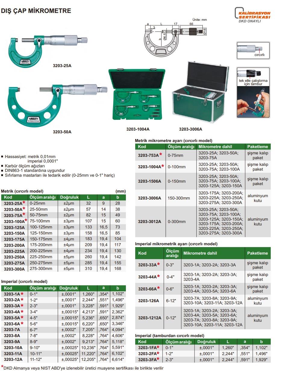İnsize 6-12″ Dış Çap Mikrometresi Set (İnç), Hassasiyet: 0.0001″